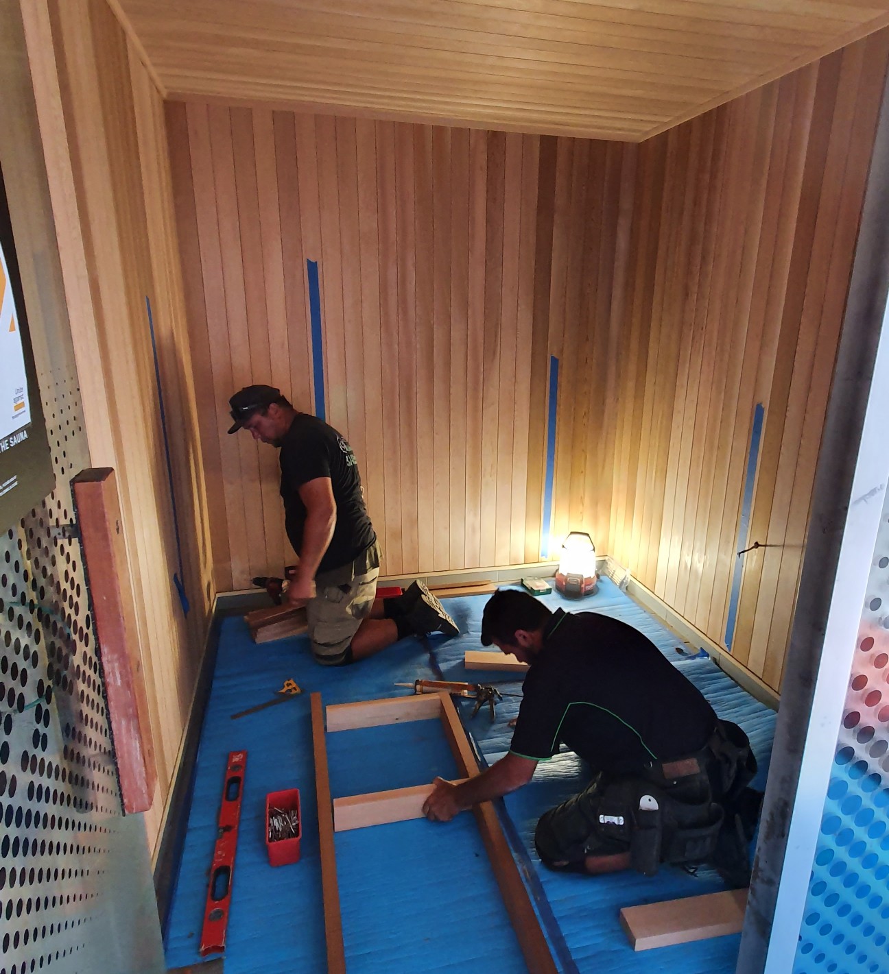 Proper insulation is essential to the performance and longevity of your sauna. Silver aluminium barrier paper reflects radiant heat back into the room, helping it warm up faster and run more efficiently. It also acts as a vapour barrier, preventing steam from damaging the framing and plasterboard. To ensure full protection, every seam should be taped and sealed, with a 25–30mm air cavity left between the insulation and cladding to create a thermal break.
