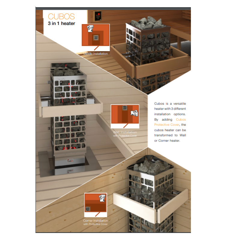 The Cubos Ni2 is a modern, versatile 3-in-1 sauna heater designed for wall, corner, or center placement, making it ideal for a wide range of sauna layouts. With optional protective covers for added support in wall or corner installations, Cubos delivers both flexibility and style.