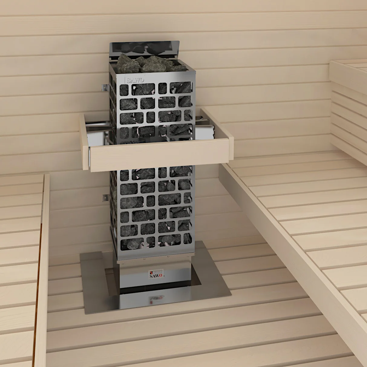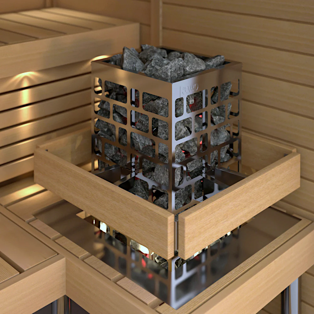 This model offers a medium, humid heat profile and features a durable stainless steel casing along with a built-in stone spacer to enhance airflow and performance. Adjustable legs make installation quick and easy. The Cubos NS is compatible with any SAWO digital control system (sold separately), allowing for customizable operation.