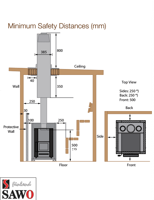 SAW0-14 (SET2) comes with 2380mm chimney, chimney adaptor, smoke flue, protective wall and floor.