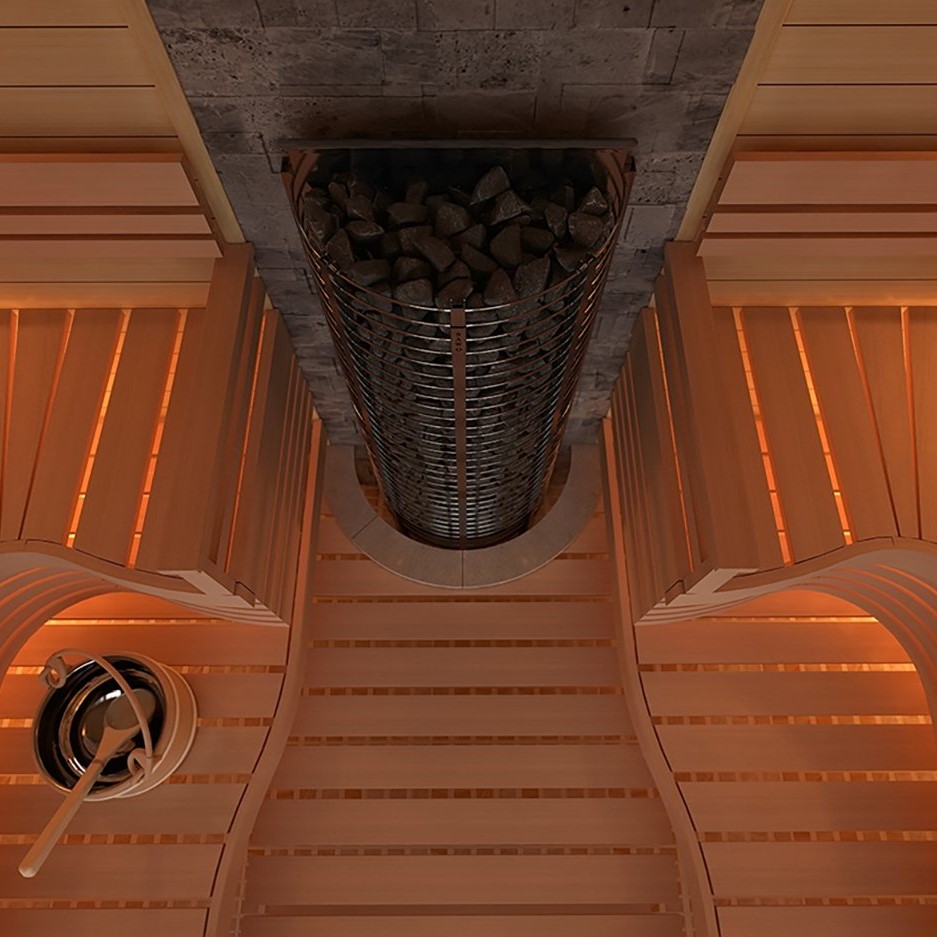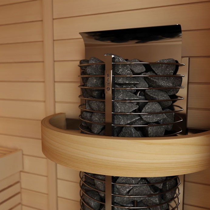 The SAWO Tower Wall Heater TH5 (5 elements) 9kW NS is the ideal choice for modest-sized sauna rooms (8m³ – 14m³). This newly improved model features a built-in stone spacer that optimizes airflow for faster heat-up times and enhances the longevity of the heating elements. The heater is designed to be placed against the wall, maximizing the available space in the sauna. The exposed stones are securely contained by stainless rods, providing durability and safety.